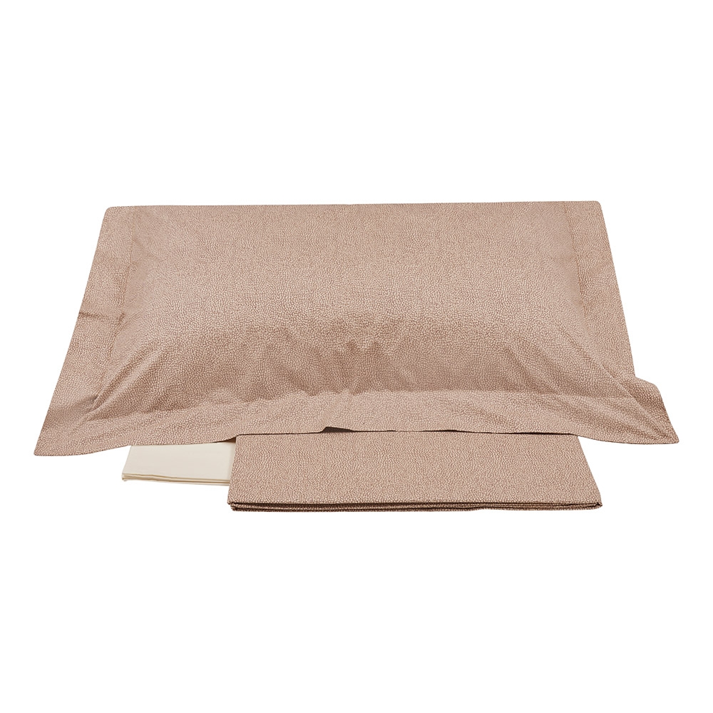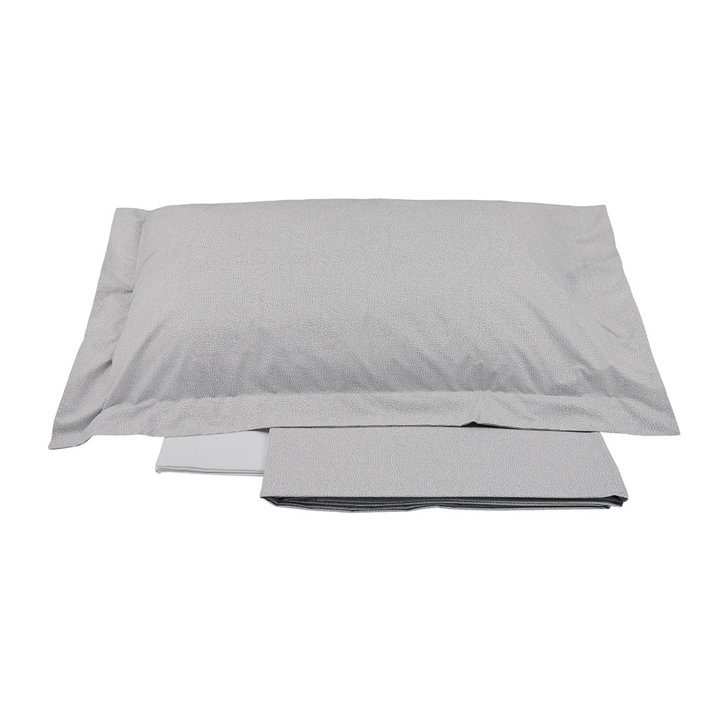Completo lenzuola in percalle di puro cotone 200 T.C. Il lenzuolo e le federe a 3 volant sono stampati con design personalizzato dall’iconica texture “OP” Occhio di Pernice; il sotto con angoli è in percalle tinta unita. Vesti di eleganza la tua casa, con l’esperienza di Tessitura Randi e il design iconico Borbonese.