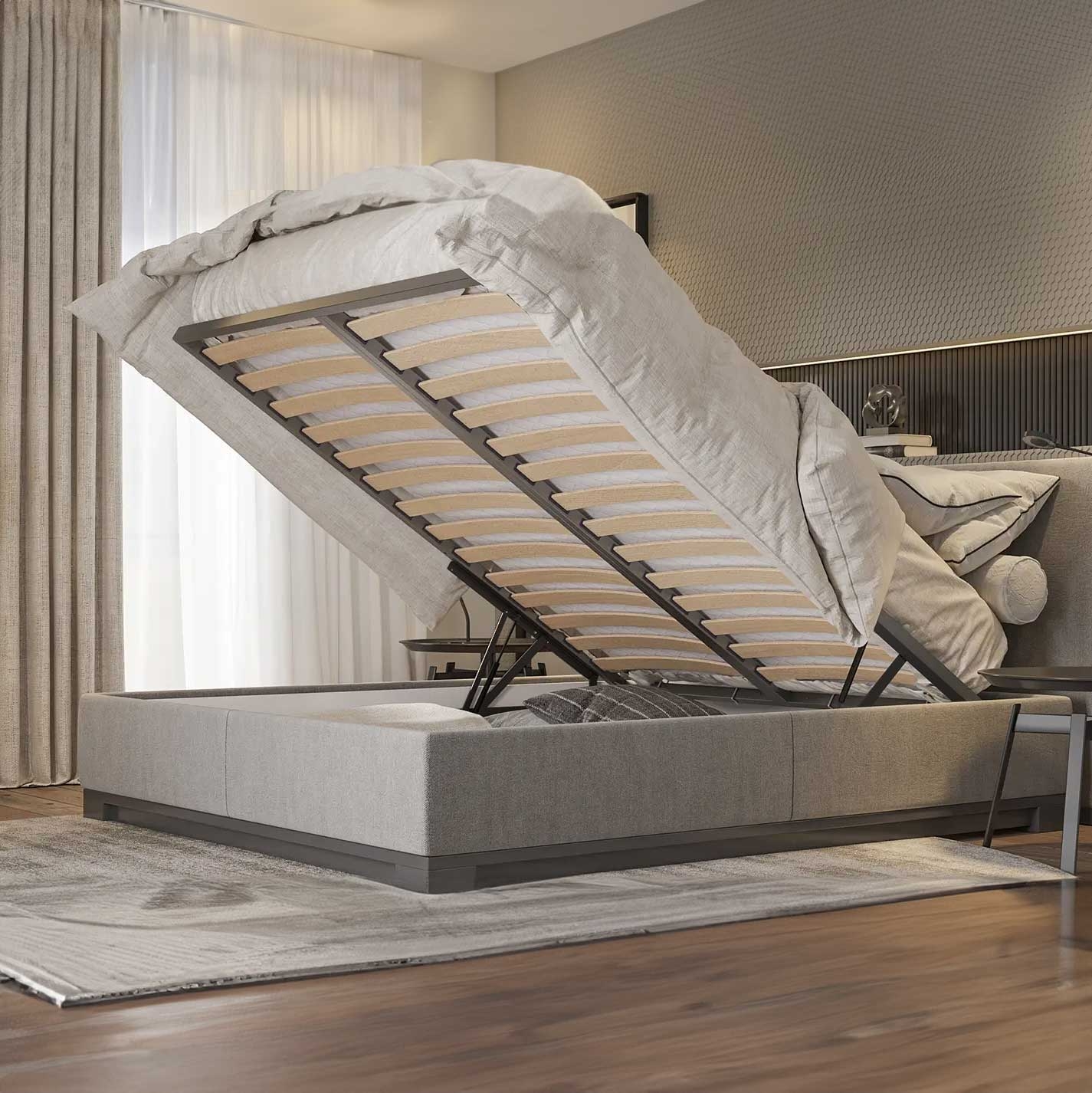 Per completare il tuo nuovo letto contenitore abbina la Rete a doghe per sistema di sollevamento Easy e utilizza anche Fondi per letto contenitore fai-da-te